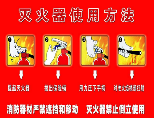 手指压住灭火器的上下把杆上,此时灭火器的开关就会被打开,会喷出干粉起到灭火功效。